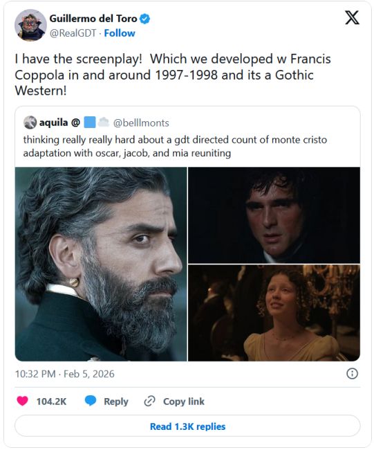 Tijekom razmjene poruka na društvenoj mreži X, u kojoj je jedan obožavatelj izrazio želju da del Toro režira adaptaciju klasika Alexandrea Dumasa Grof Monte Cristo (Le Comte de Monte-Cristo) s Elordijem, Isaacom i Goth u glavnim ulogama, hvaljeni redatelj dao je odgovor koji je sve iznenadio: “Imam scenarij! Razvijali smo ga s Francisom Coppolom negdje 1997.–1998., i to je gotički vestern!“